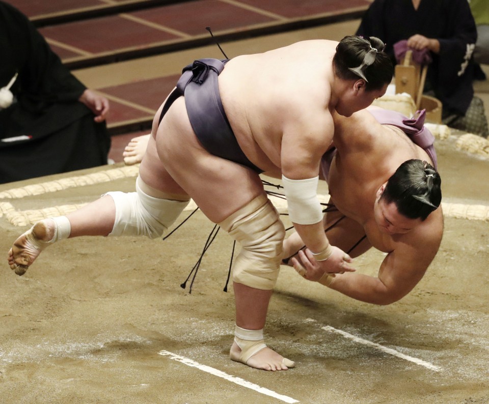 Fellow sekiwake Mitakeumi suffered his first defeat, however, after failing to navigate his way around incessant shoves from No. 2 Daieisho (2-0). Mitakeumi looked to capitalize on a weak pull-down attempt by the maegashira, but was upended by a timely thrust down at the edge.