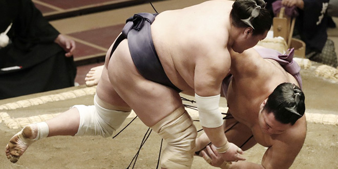 Fellow sekiwake Mitakeumi suffered his first defeat, however, after failing to navigate his way around incessant shoves from No. 2 Daieisho (2-0). Mitakeumi looked to capitalize on a weak pull-down attempt by the maegashira, but was upended by a timely thrust down at the edge.