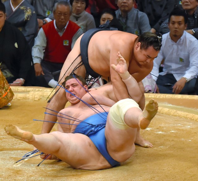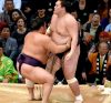 On a day of contrasting fortunes for the three Mongolian yokozuna, championship favorite Hakuho also came through with a routine win, but Harumafuji came a cropper and fell to his first loss at the hands of Egyptian bruiser Osunaarashi (1-1).
