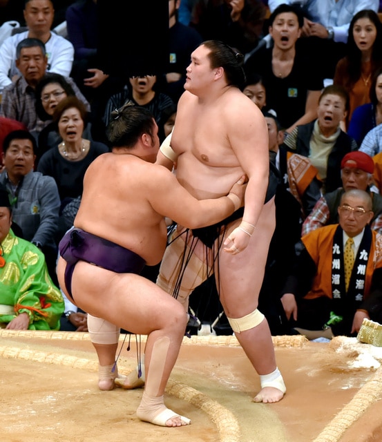 Relegation-threatened ozeki Goeido charged out third-ranked maegashira Toyonoshima (1-1) to stay perfect and Fukuoka’s favorite son Kotoshogiku (2-0) gave the crowd more to cheer about when he thrust Georgian komusubi Tochinoshin down to his second defeat.