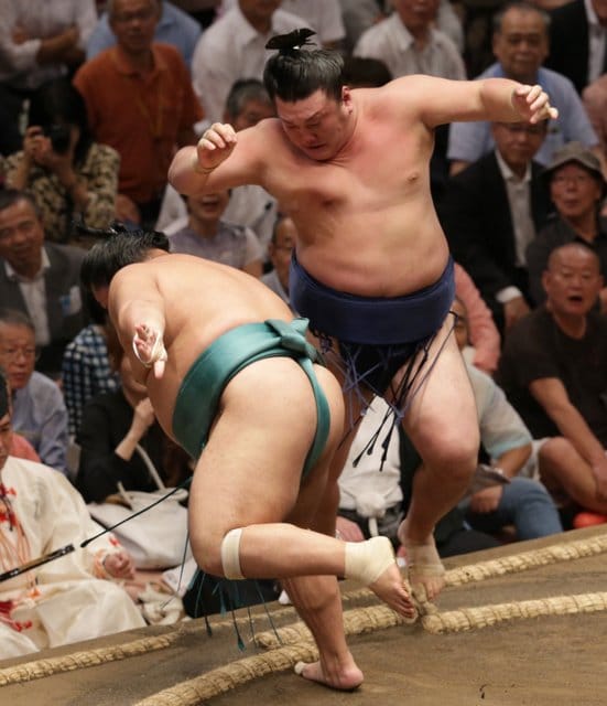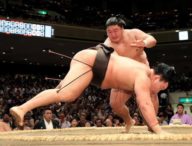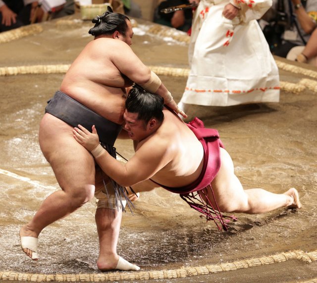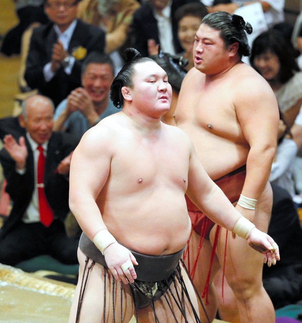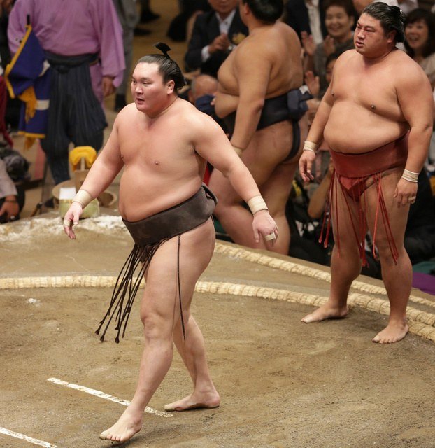 Ozeki Terunofuji (2-0), who is in his second straight tournament at sumo’s second-highest rank, made quick work of Okinoumi (1-1) after getting his left hand on the back of his opponent’s mawashi and marching him over the straw bales.