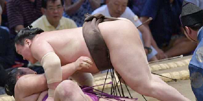 Returning ozeki Tochinoshin took his second loss after a bout with No. 3 Shodai (2-0). The Georgian was simply outmuscled by Shodai despite locking into his favored « migi-yotsu » right-underarm, left-overarm hold.