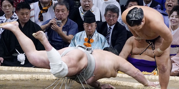 Même posture adoptée par Hoshoryu qui bat Hokutofuji par hatakikomi.