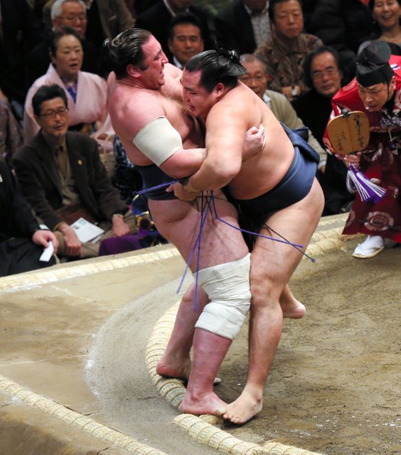 Hoping to finally gain some traction, sekiwake Ichinojo had a strong face-off and gathered enough momentum to escort Bulgaria’s Aoiyama out of the ring for his first win of the tournament.