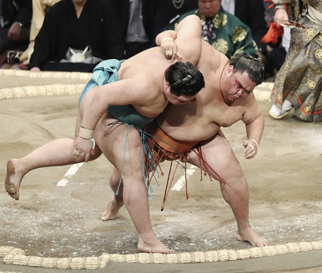 Both sekiwake also prevailed on Day 3, with Mitakeumi (2-1) absorbing a bloody blow above his right eye before forcing out No. 2 Meisei (2-1). Tochinoshin (1-2) slapped down komusubi Endo (1-2) to pick up the first of 10 wins needed here to regain ozeki status.