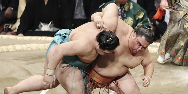 Both sekiwake also prevailed on Day 3, with Mitakeumi (2-1) absorbing a bloody blow above his right eye before forcing out No. 2 Meisei (2-1). Tochinoshin (1-2) slapped down komusubi Endo (1-2) to pick up the first of 10 wins needed here to regain ozeki status.