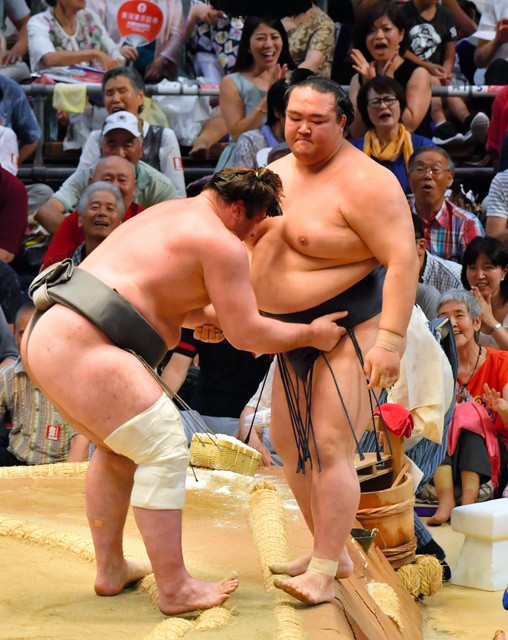 Takakeisho est tombé entre les mains du yokozuna Harumafuji qui a remporté son premier match du tournoi. C’était la première fois que les deux hommes s’affrontaient.