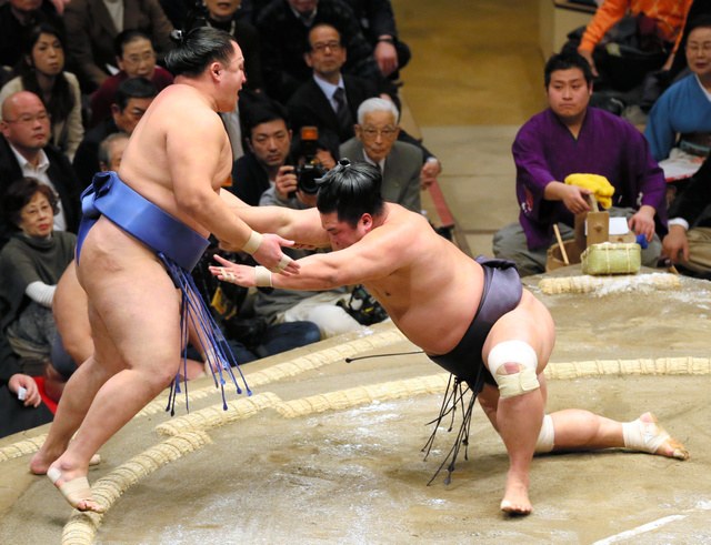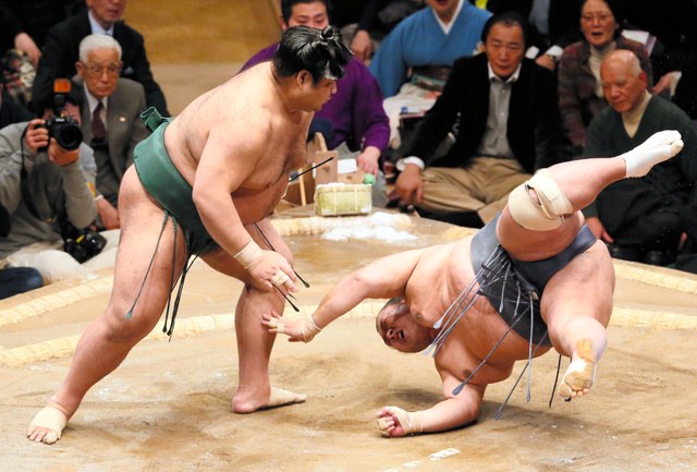 A day after a slick win over Harumafuji, Shohozan was in the ring against Hakuho, whom he’d never beaten in nine tries. After a solid start, the 139-kilogram Shohozan (1-2) fell back under a withering volley of shoves and slaps from the larger yokozuna and was forced out.
