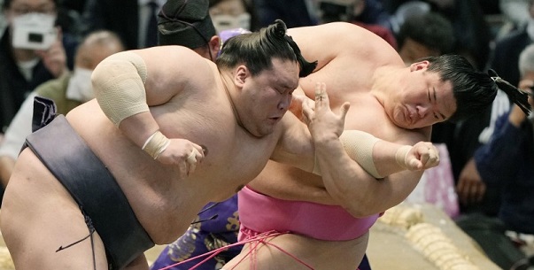L’ôzeki kadoban Takakeisho, qui a besoin de huit victoires pour rester à son rang, a perdu pour la deuxième journée consécutive, sortant à l’extérieur sur un ultime lancer de bras du nouveau komusubi Hoshoryu, qui lui, acquiert sa première victoire du tournoi. Takakeisho s’était lancé de tout son élan en bulldozer sur le neveu de l’ancien yokozuna mongol Asashoryu jusqu’au bord du dohyô, mais au dernier moment, c’est bien Hoshoryu avec son bras droit qui renversa l’ôzeki.