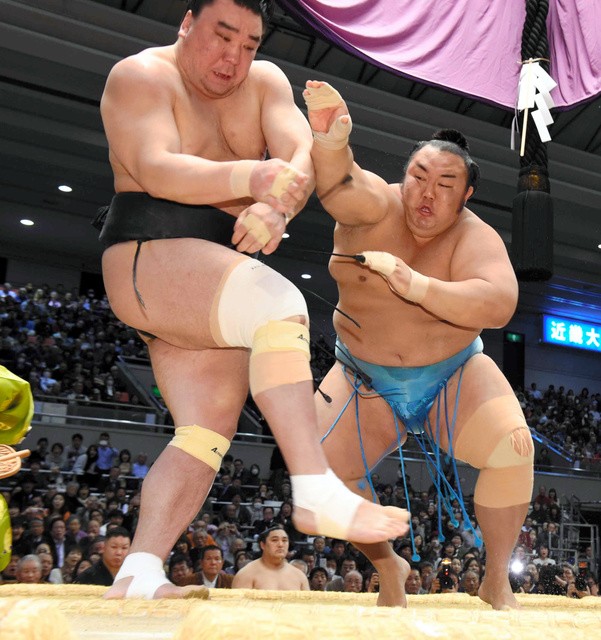 Against an opponent he had routinely beaten in the past, Kotoshogiku needed two tries to overcome No. 2 maegashira Tochinoshin but was never in danger of losing at Edion Arena Osaka, where all three yokozuna finished the day at 2-1 and all four ozeki wrestlers remained perfect in the 15-day meet.