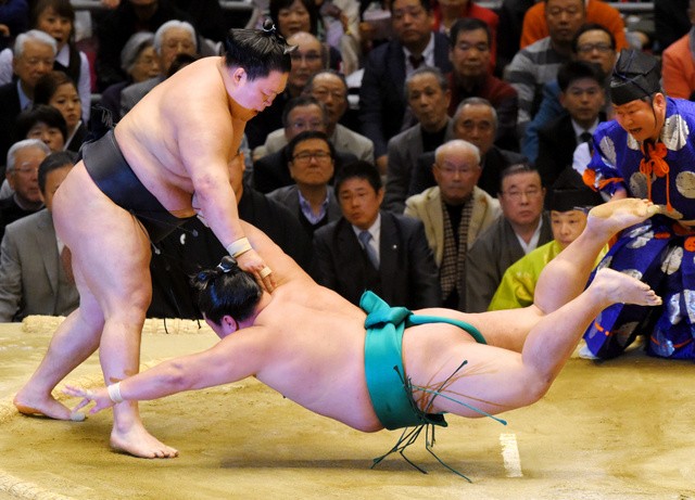 The third yokozuna, Kakuryu, followed Harumafuji to the raised ring and did well to avoid his compatriot’s fate. It took a grueling 45-second effort, but Kakuryu improved to 2-1 against upset-minded Okinoumi. The No. 2 maegashira fended off numerous attacks, but was worn down at the end and felled by an overarm throw.