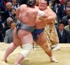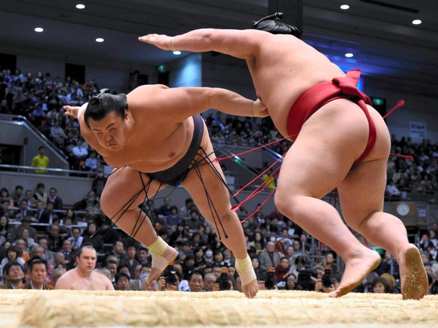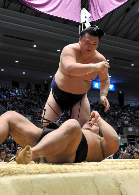 Hakuho was joined at 2-1 by fellow Mongolian yokozuna Harumafuji, who could only offer an ineffectual slap against an opponent who outweighs him by 31 kilograms. Kotoyuki (1-2), a top-ranked maegashira, brushed aside the slap and delivered two blows to the throat before shoving the yokozuna from the ring.