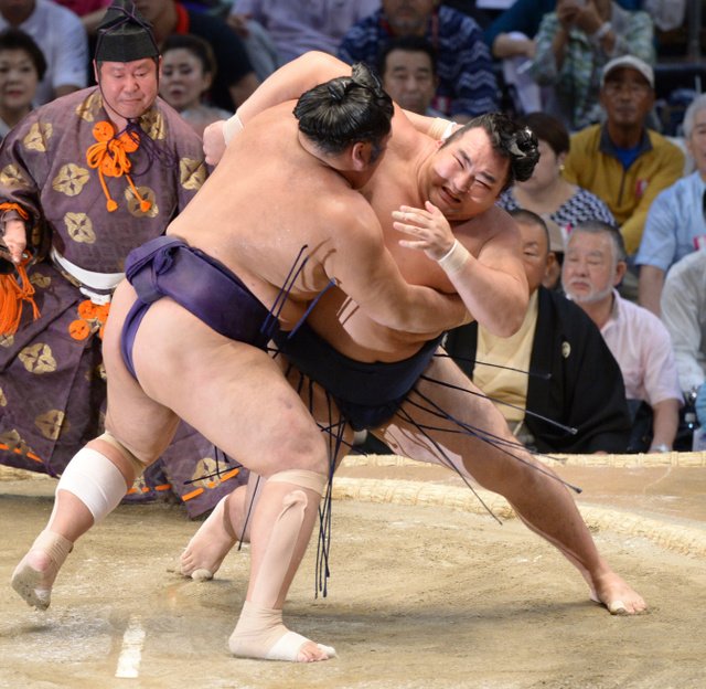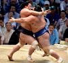 Promotion-chasing ozeki Kisenosato won a routine bout against Takarafuji (2-1), bundling up the No. 2 maegashira’s arms on the tachiai as a prelude to a belt hold and an easy force-out. The loss dropped Takarafuji to 1-12 in his career against Kisenosato.