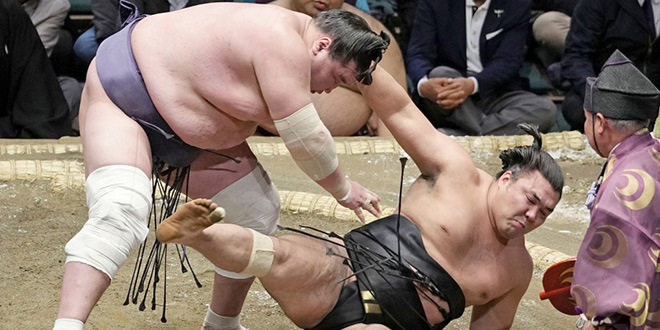 Le yokozuna Terunofuji (2-1), qui affrontera Kotonowaka mercredi, s’est imposé pour la deuxième journée consécutive après avoir tenu à distance le numéro 2 Kiribayama (1-2).