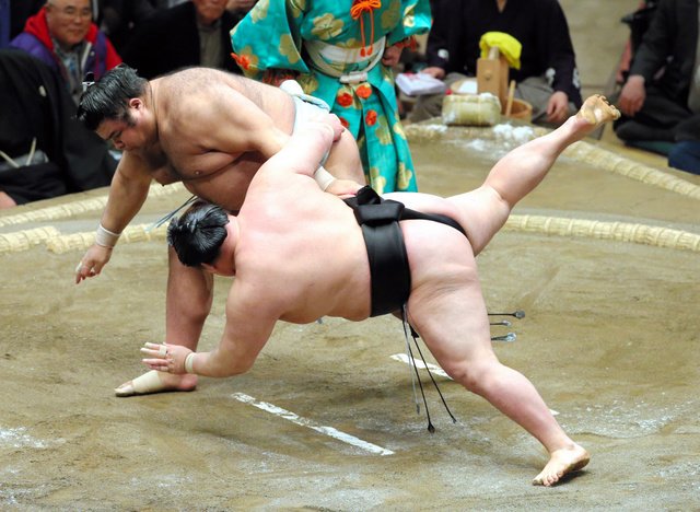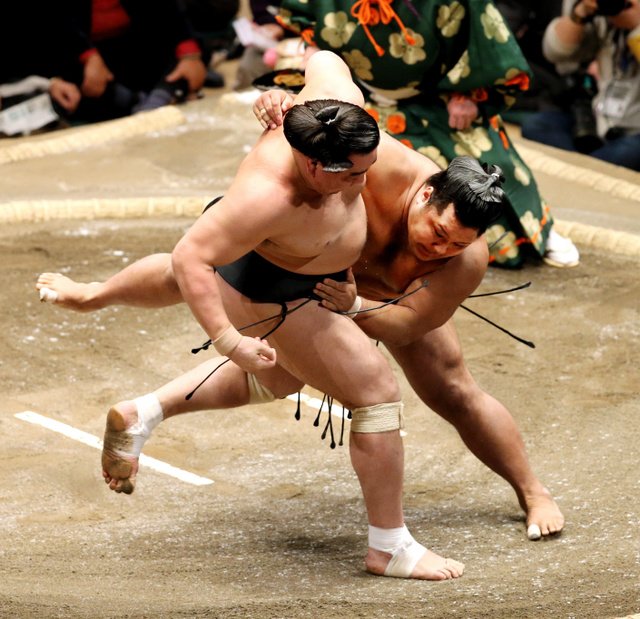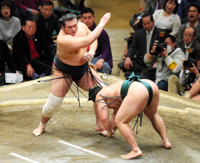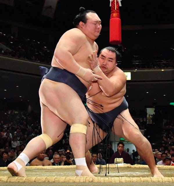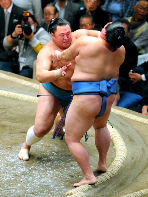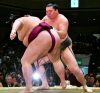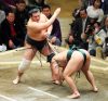 Takayasu (2-1) dug in his heels and turned the tables on Goeido (1-2), who failed to charge the komusubi out of the ring on the tachiai. When Goeido shifted his weight to take a different approach, Takayasu grabbed a left-hand underarm hold and used it to tip his opponent over for his second straight win over an ozeki.