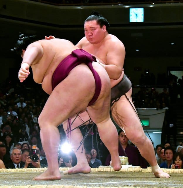 Takayasu avait de bons appuis, les talons bien encrés dans le sol, pour remporter son face à face avec l’ôzeki Goeido.