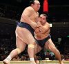 Kakuryu improved to 11-1 in his career against Takarafuji (0-3). Repeated shoves to the throat and jaw forced the top-ranked maegashira back to the straw on the tachiai, and from there he was easily dismissed.
