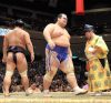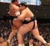 Terunofuji et Osunaarashi se sont confrontés dans un match de titans où l’égyptien est allé puiser dans ses réserves pour résister aux tentatives du mongol pour le sortir. Les pieds en appuis sur les ballots de paille, Osunaarashi a été obligé de succomber aux poussées du mongol.