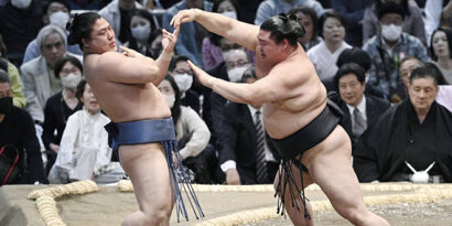 Le champion du tournoi de janvier Takakeisho (2-2) a été rapidement submergé par Abi (3-1). Le maegashira a sauté immédiatement sur sa droite et balancé l’ôzeki par le cou.