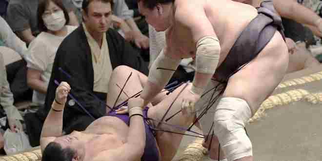 Mitakeumi, luttant en tant qu’ozeki « kadoban » menacé de rétrogradation, est tombé à 2-2, expulsé par Tobizaru (2-2). Le maegashira 1 a surclassé l’ozeki lors de la charge d’ouverture, s’est emparé de la ceinture de son adversaire et a pris le contrôle définitif du combat.