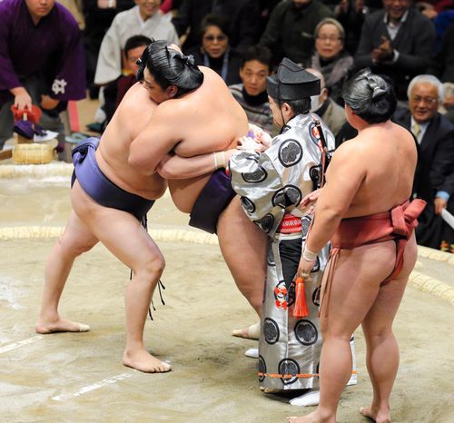 L’anecdote amusante du jour nous vient du combat en Sadanofuji et Tokitenku où le gyôji a du intervenir plusieurs fois afin de resserrer le mawashi de Sadanofuji qui ne tenait pas en place. Devant la répétition de l’incident, Yoshikaze est même monté sur le doyhô alors qu’il attendait son tour pour combattre afin de prêter main forte à l’arbitre avant que celui-ci ne décline son aide.