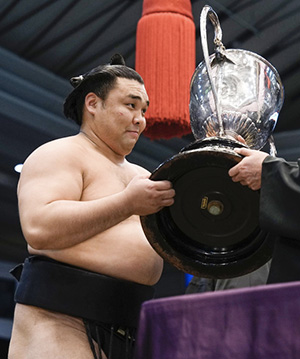 Each time Goeido tried to muscle his way to victory, the giant Ichinojo stood firm. He eventually used his roughly 60-kilogram advantage to maneuver the ozeki to the straw and hoist him out backwards.
