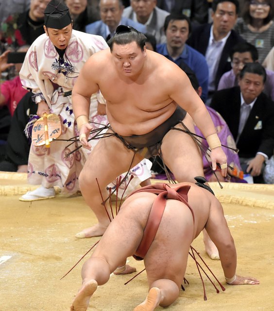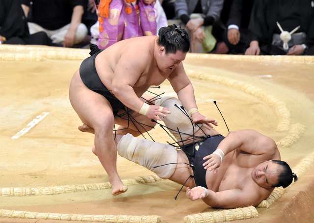 Mongolian ozeki Terunofuji also stayed one win off the pace with a victory over winless Bulgarian bruiser Aoiyama. Aoiyama looked to have the advantage after the charge, but Terunofuji regrouped and floored the second-ranked maegashira with an overarm throw.