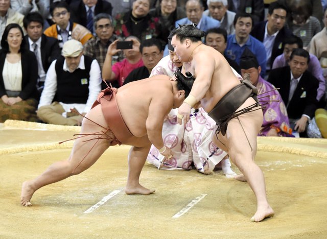 Kisenosato had his hands full against Georgian grappler Tochinoshin but huffed and puffed his way past the komusubi to tough out a third win. Tochinoshin dropped to 1-3.