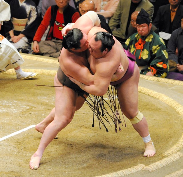 But longtime ozeki Kisenosato’s (2-2) hopes of winning an elusive first title took another early blow when he was muscled to the dirt by Georgian komusubi Tochinoshin (2-2).