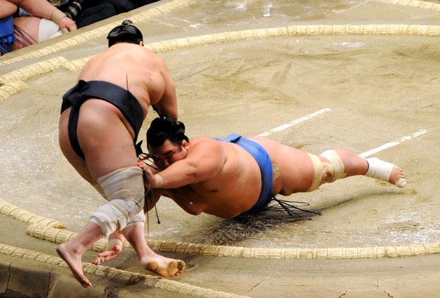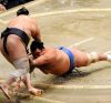 Kotoshogiku maintained his unbeaten start against Aminishiki, the ozeki managing to shove the veteran No. 1 maegashira over the edge of the ring before crashing to the sandy surface. Aminishiki dropped to 2-2.