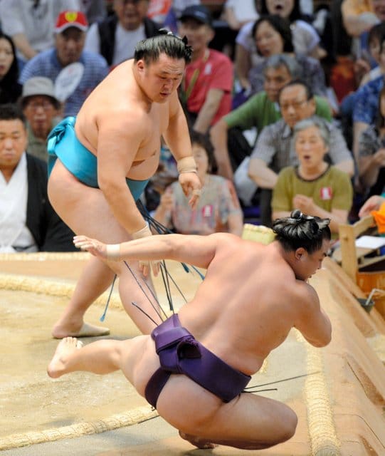 Ozeki Goeido (2-2) rebounded from Tuesday’s loss to Takayasu, ramming fourth-ranked maegashira Shohozan (1-3) over the ridge, but Kotoshogiku’s tournament took another downward turn when the ozeki was bumped out from behind to a fourth straight loss by second-ranked Takarafuji (3-1).