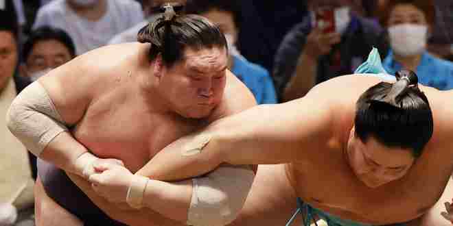 Mitakeumi (2-2), l’autre ozeki kadoban menacé de relégation, n’a eu besoin que de quelques secondes pour conduire le maegashira Kiribayama (2-2) dans la poussière.