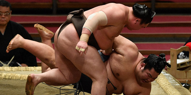 But Hakuho, who has had one tough win after another in Osaka, recovered and grabbed an inside left-handed belt hold in the process. As Tokushoryu forced him back, the yokozuna flipped his opponent with a slick underarm throw.