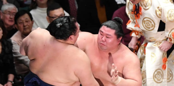 Endo (4-1) beat new sekiwake Asanoyama (3-2) to remain in contention for his first title. Endo had the initial momentum before Asanoyama rallied and drove him back, but the top-ranked maegashira turned his opponent around and pushed him out with a two-handed outside belt grab.