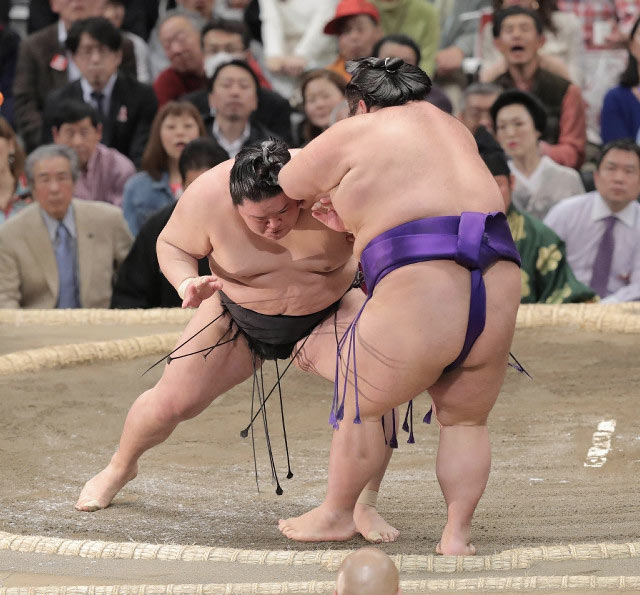Sekiwake Mitakeumi (4-1) stayed in the hunt by beating Mongolian top-ranked maegashira Tamawashi (2-3). The pair traded pushes and slaps after Mitakeumi attempting a throw in the opening exchange, with the Japanese-born wrestler getting the victory by push out.