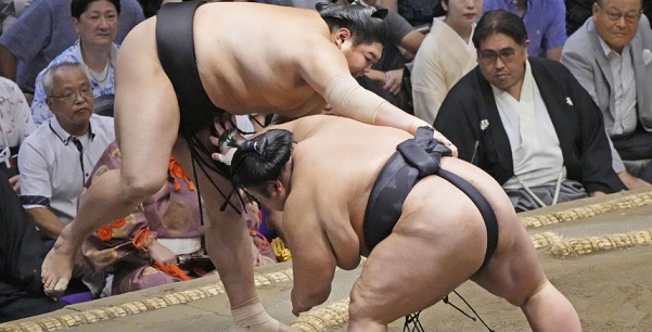 Les trois ôzeki ont tous gagné pour la première fois lors de ce tournoi à Tokyo, notamment avec Hoshoryu qui n’a pas été encore tout à fait convaincant mais qui a mis fin à sa série de trois défaites consécutives. Le nouvel ôzeki a momentanément reculé après avoir poussé le vétéran Tamawashi au bord du dohyô, mais a fait une deuxième incursion pour vaincre le M3 également en poussée.
