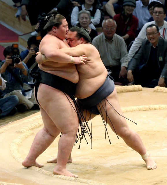 Back in the upper ranks, Kakuryu (3-2) got more than he bargained for against Myogiryu (2-3), who came charging forward to send the yokozuna backpedaling out of the dohyo.