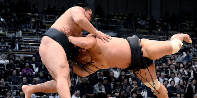 Back in the upper ranks, Kakuryu (3-2) got more than he bargained for against Myogiryu (2-3), who came charging forward to send the yokozuna backpedaling out of the dohyo.