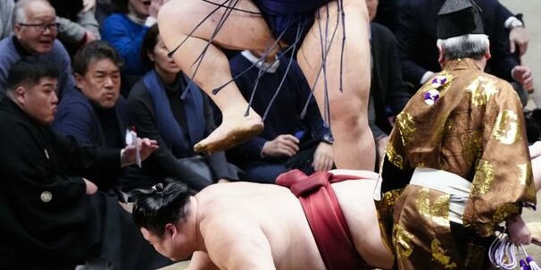 Souffrant d’une blessure à l’épaule gauche, Onosato, quintuple vainqueur de la Coupe de l’Empereur, a été mis en difficulté, mais a évité une deuxième défaite en prenant appui sur les limites en paille du dohyô au moment de terrasser le maegashira 3 Takanosho, qui n’avait, lui, encore remporté aucun combat.