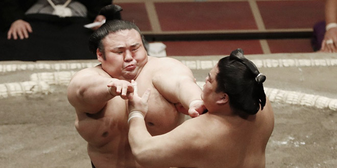 New sekiwake Takanosho also improved to 3-2 after pushing out No. 1 Kiribayama (1-4), while komusubi Takayasu was thrust down to his fourth loss by No. 3 Okinoumi (4-1).