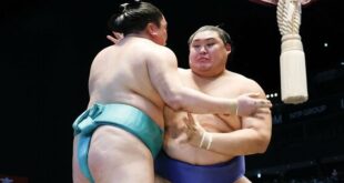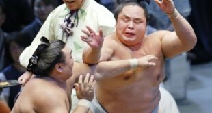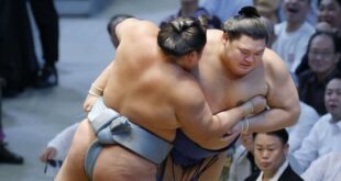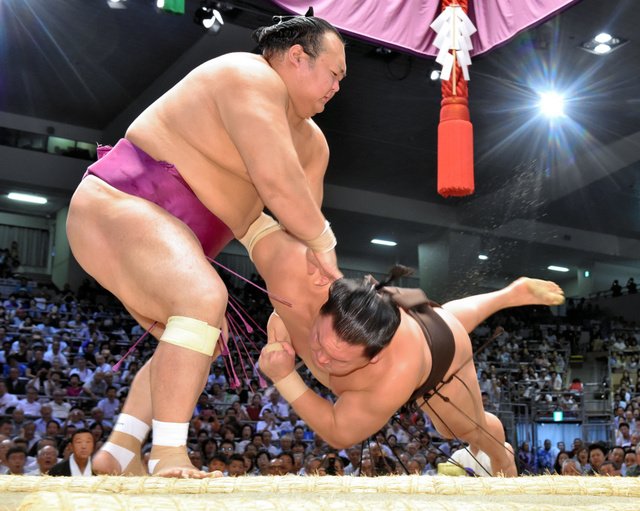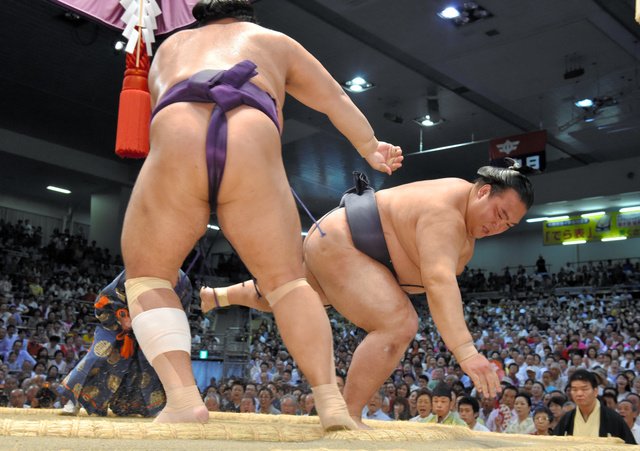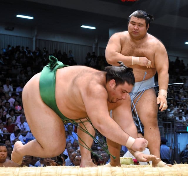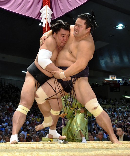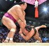 Kisenosato twice backed top-ranked maegashira Tochiozan to the straw, but was too slow to finish him off the first time and too rash in his second effort. His back to the bales, Tochiozan (3-2) slipped back to the middle of the ring only for Kisenosato to force him back again. After missing the mark once, Kisenosato powered up for another go — but telegraphed his move. Tochiozan dodged out of harm’s way and the ozeki handed himself his first defeat.