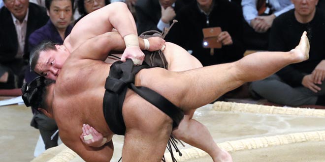 Yokozuna Kisenosato won his second straight bout to improve to 4-2 and avoid falling further out of the lead. Kisenosato drove winless No. 2 maegashira Tochiozan back with his initial charge but failed to power him out. The yokozuna then changed tactics. He lured Tochiozan into taking a step toward the middle of the ring and twisted him down to defeat.