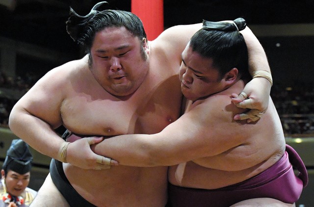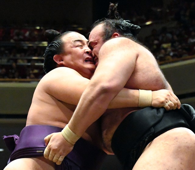 With both knees heavily taped, Mongolian Terunofuji (2-4) had no staying power as he succumbed to his fourth straight defeat after he was forced over the straw bales by in-form Georgian No. 4 maegashira Tochinoshin (5-1), who won five in a row.
