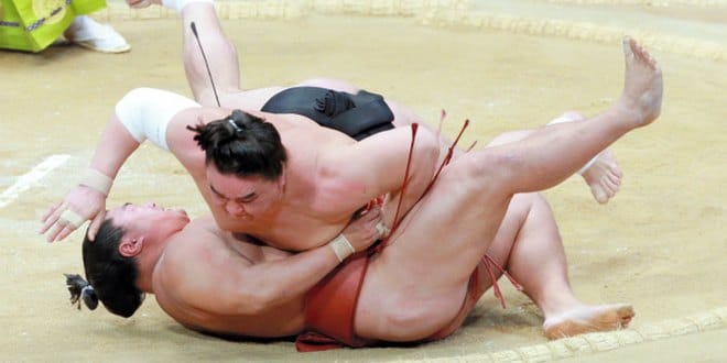 Harumafuji, however, wrapped up his opponents’ arms on the charge and threw his nemesis down with a kotenage armlock throw.