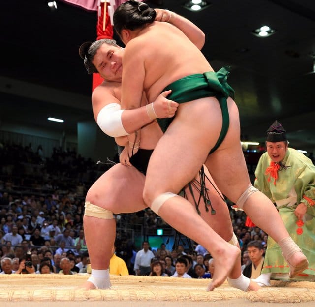 Kotoshogiku qui est menacé de perdre son rang s’il ne parvient pas à obtenir huit victoires, s’est facilement imposé face au komusubi Takarafuji en bondissant sur lui et en le repoussant par petits bons jusqu’en dehors du dohyô. L’ôzeki améliore son score à 3-3 alors que Takarafuji peine avec déjà cinq défaites!