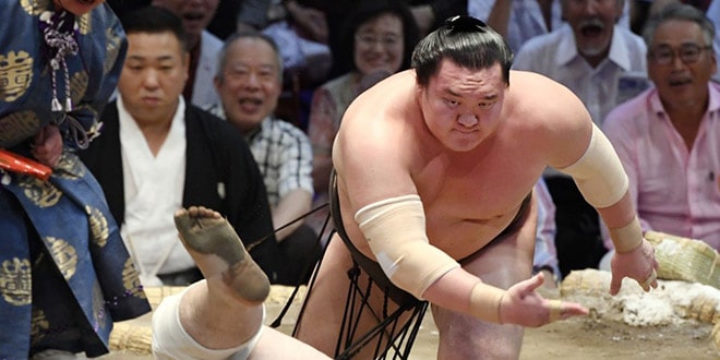 Despite pummeling Daieisho with a flurry of blows, the powerfully built ozeki was forced to backpedal before he slapped down his opponent at the edge of the ring.