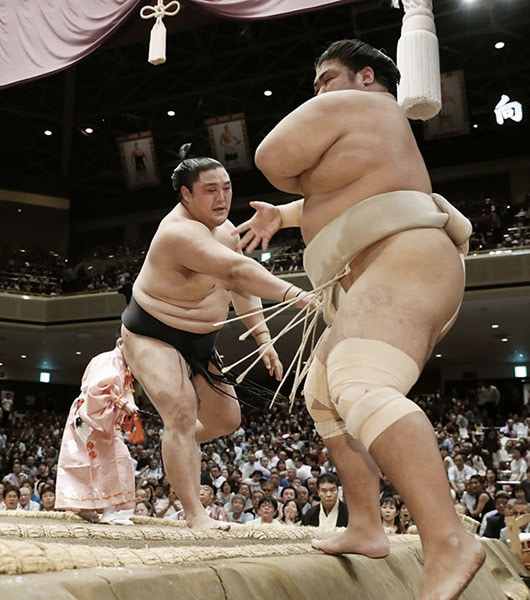 Having lost all four of his previous bouts against Kakuryu, Daieisho doggedly fended off the Mongolian grand champion, who is seeking his second straight championship after winning July’s grand tournament in Nagoya. It was the maegashira’s first career win over a yokozuna.