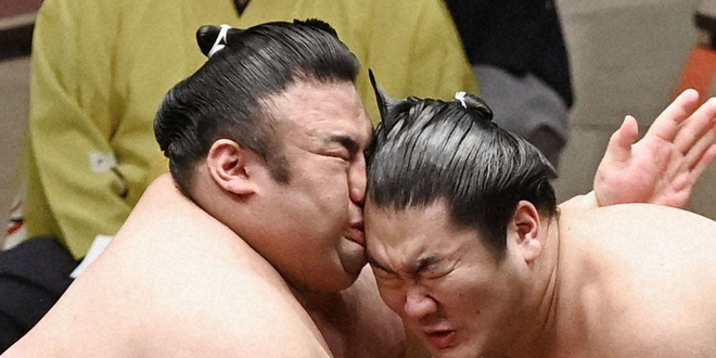 The only other undefeated wrestler from the elite « sanyaku » ranks below yokozuna, komusubi Terunofuji, also improved to 6-0 by overpowering No. 1 Kiribayama (1-5).