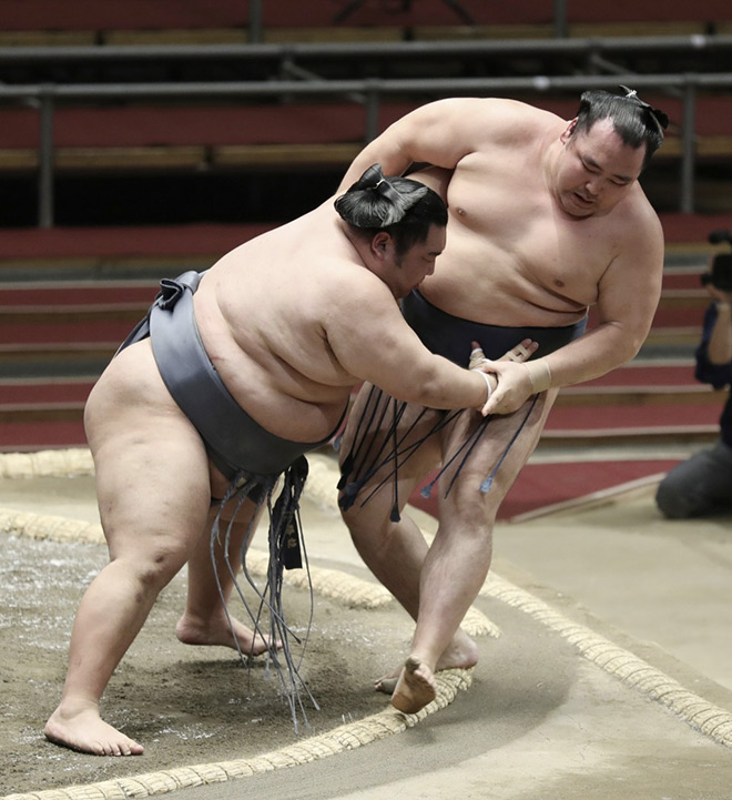 In one of the day’s most entertaining bouts, two-time Emperor’s Cup winner Mitakeumi took a double inside grip from the jump and withstood multiple throw attempts on the way to a force out victory.