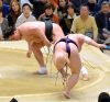 Harumafuji sprang on Takekaze (1-6) at the tachiai and was nearly knocked off-balance by his diminutive opponent, who backed over the straw bales to a sixth defeat.